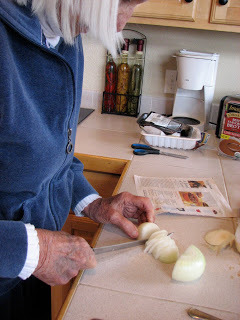 I enlisted Mom to dice the onions because they make my eyes water and because Mom never thinks I get the dice small enough to her liking.....so have it, Mom!
