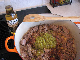 Once the meat it browned we added a can of green chilies, the jalapeno, and the onions. Oh, and that bottle of beer you see in the background.