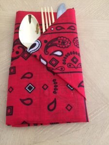 Now I know that some people have a negative view of bandanas, however you don’t have to wear one on your head if you don’t want to. This young lady posed for me wearing one as a scarf. You can do that or use it in your holiday decorating. I tried a couple ideas that I picked up here and here,I must say I’m really pleased with the effect. I think you will be too once you try them.