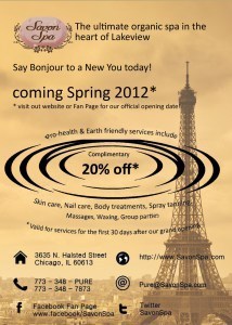 Someone I am close to, well, okay it's my daughter, is opening up a new salon in Chicago. It's to be the Savon Spa and is on Halsted St. in the heart of beautiful Lakeview. They will offer a variety of services, (things I never do) like spray tans, and facials, and something called micro dermabrasion (doesn't that sound painful?), nail care, massage, stuff like that.