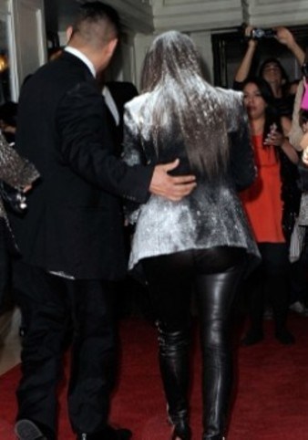 On to someone else we’ve read about in People We Can’t Remember Who the F%&k They Are Magazine (again credit goes to A. Borowitz, see above), Kim Kardashian has been flour-bombed! Apparently, at an event for her new fragrance True Repulsion, oh wait, that’s Reflection, a woman strolled casually onto the red carpet with a zip-locked baggie full of the white stuff and dumped it on our favorite Reality (if this is Reality give me Fantasy — please!) Star’s head.