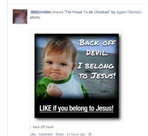 Really annoying posters. Speakig of the devil. Oh my. This is offensive on so many levels. First of all, how do you know this kid feels that way? Did you ask him? Did you get his permission to use his image on this poster? Aren’t you kinda playing with fire here? What if this lovely urchin turns out to be an agnostic? He might sue you when he grows up, and you know? That would, like totally serve you right.
