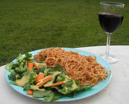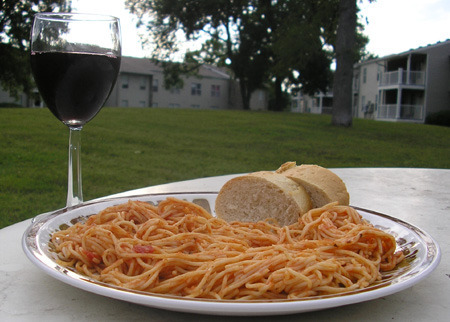 Unfortunately, what you're looking at isn't spaghetti but angel hair pasta...which is nutritionally the same and costs the same but doesn't look as pretty with the tomato sauce. Thinner noodles means more surface area and thinner looking sauce. My co-writer prefers it and had already cooked it, so we decided not to waste the noodles. Personally I love spaghetti sauce with spiral and tri-color noodles, but spaghetti sauce will make a meal out of most types of noodles or bread.