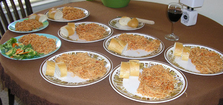 I'm on the hold list at the public library for a copy of "Make the Bread, Buy the Butter", because the reality is that it's cheaper and more efficient to buy some things pre-made, while others things cost far more this way. I think Spaghetti Sauce falls on the pre-made list (unless you grow your own tomatoes and have lots), particularly if you prefer it smooth to chunky. The French Bread on the other hand...probably cheaper from scratch, going to find a decent recipe and get back to you on that one with a comparison to store bought bread. Regardless, spaghetti is a great way to feed a bunch of people for a small amount of money. We divided up a cooked 1lb box into eight 2oz. (pre-cooked) servings.