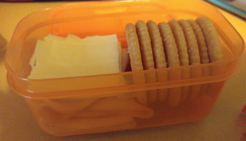 So I've started making "lunchables" for my nephew in the morning for his lunch that usually look like what I've pictured above. Since they're only stored for a few hours instead of potentially weeks, it's not important to separate the different foods with dividers. That's 8 Ritz Crackers, 1 slice of swiss cheese folded and broken into four pieces and stacked on top of four folded thin slices of turkey. I usually give him fruit in a separate container as well.