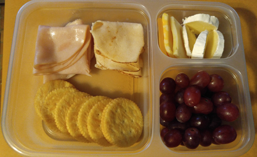 Kind of looks like a meal of party leftovers, but it hits 4 out of 5 food groups. I had two slices of chicken left, so I used 2 different meats, 2 or 3 different cheeses, and fresh grapes.