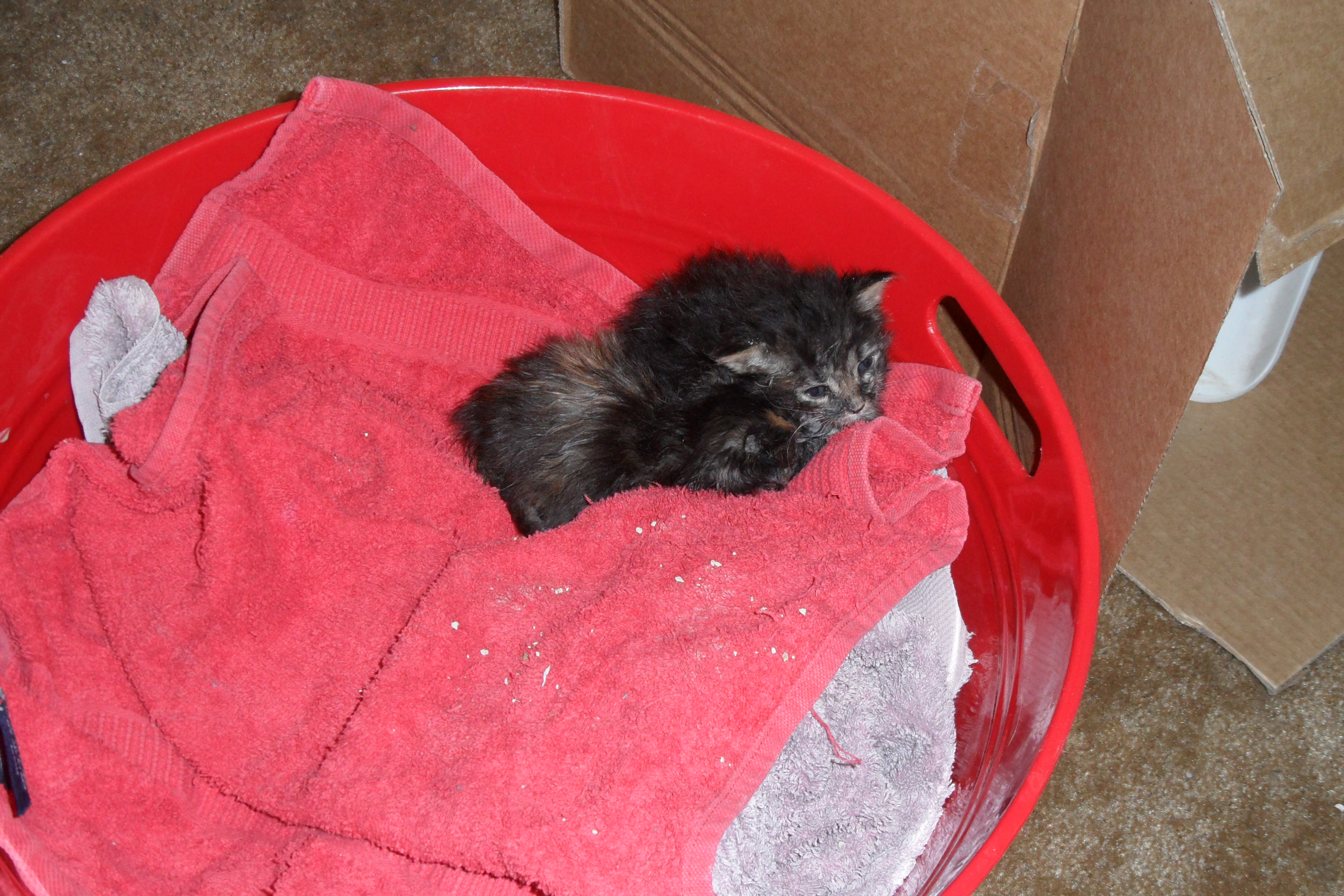 Vlad is the little man with the V between his eyes. The other, doing the faceplant as she likes to do, is Gizmo. They are three weeks old, and have to be bottle-fed about every four hours.