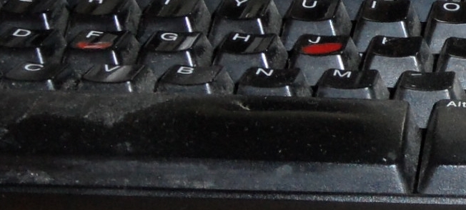 K is worn partly off, L completely gone (I use Dvorak, so that's actually T and N worn off). Half the space bar–I generally space with my right thumb–worn smooth, the other half dusty and barely used. (Once when my right thumb was injured, I tried to teach myself to use the other. It was awkward and hampering and I reverted as soon as I could, though I meant to keep it up.)