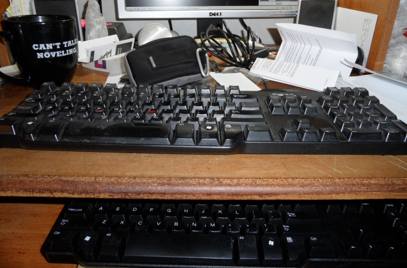So. Welcome the new keyboard, seen here under the old keyboard. (Yes, my desk is a mess. It happens.)