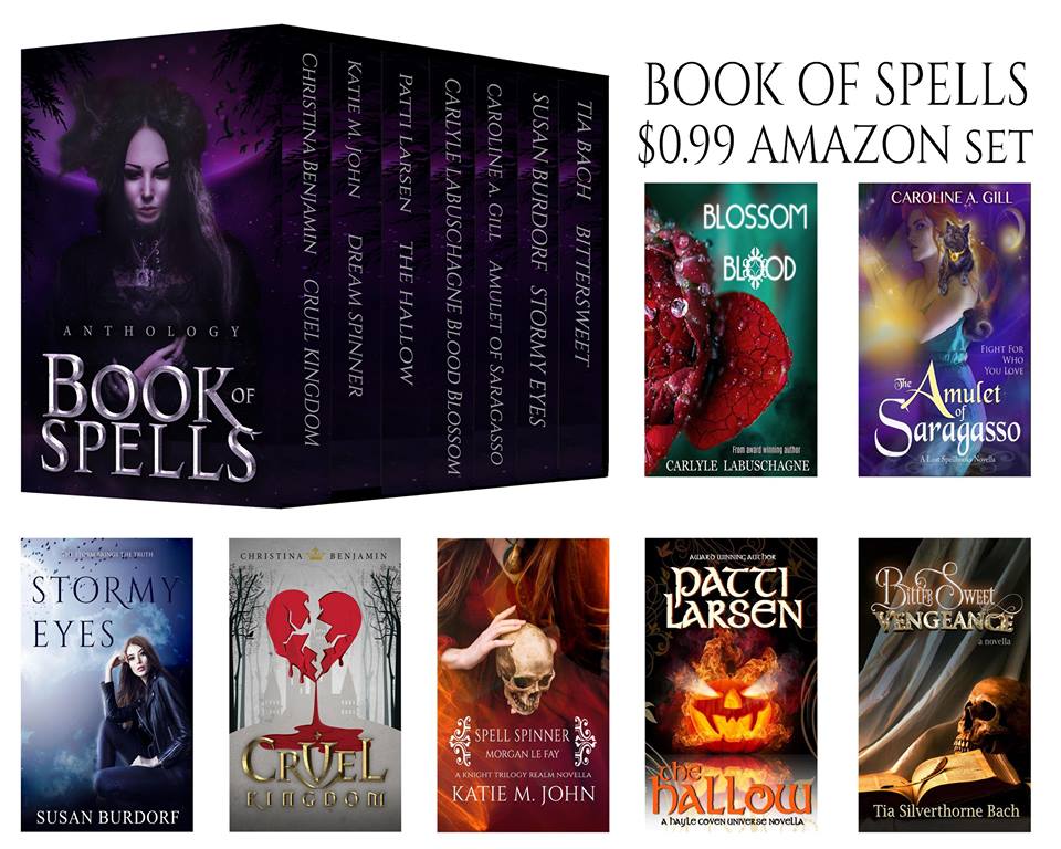 Book of Spells includes 7 original novellas from 7 authors: Christina BenjaminKatie M JohnPatti LarsenCarlyle LabuschagneCaroline GillSusan Burdorfand me!