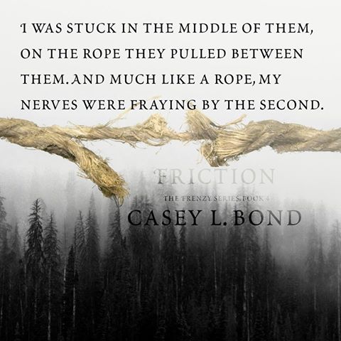 Title: Friction (Frenzy, #4) Author: Casey L. BondGenre: YA ParanormalCover Designer: Cover Me DarlingModel: Daniel WellsCover Photography: Cassy Roop of Pink Ink DesignsExpected Release Date: Early August 2016Hosted by: Lady Amber’s PR