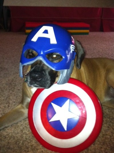 A lovely American boxer named Jazzy (kids named her Jasmine after Aladdin, but it was too long). As you can see from the picture, she loves our children and will let them do anything to her.