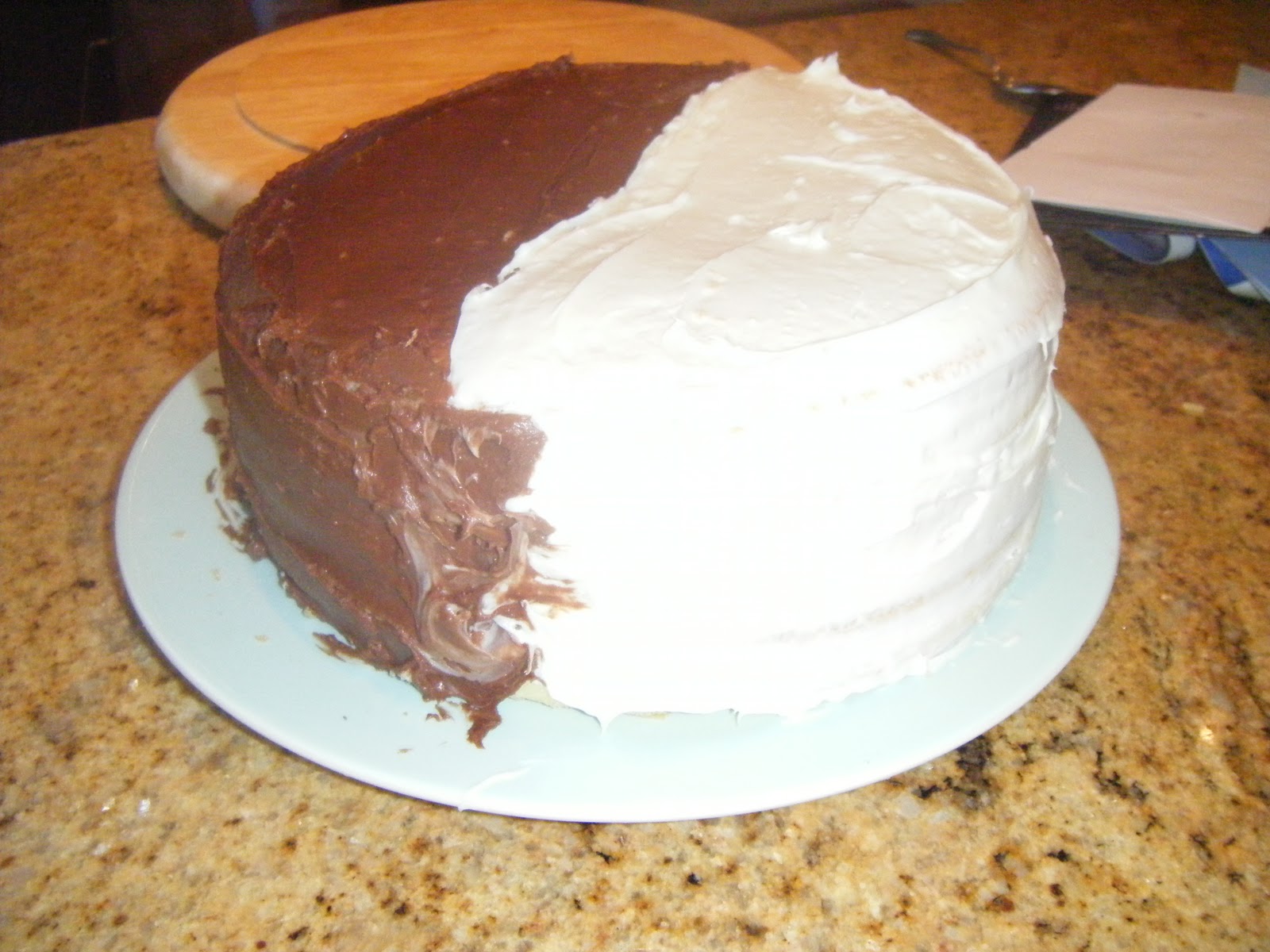 Place cake layer on plate and spread approximately 1 tbsp of icing on a layer (you want it to be a thin coating), keep repeating until last layer is used. Use rest of icing to ice the sides and top of the cake.