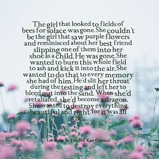 She walked with Lexy for what felt like hours into the backdrop of the crimson sunset. Something changed and the silky sensation of her steps in the sand gave way to the rustling of grass underfoot. She now stood in the center of and an endless field. Her soul had brought her to see something beautiful. The scenery before her that she’d once adored now felt like a devastating symbol of her mortality. The field, overflowed with delicate purple flowers. She closed her eyes and listened to the soothing hum of the bumble bees, hoping it would bring her back to a better time and place. Visions of her childhood flashed through her line of sight. There they were as children, lying in the field together, as always, watching the clouds drift by. Kayn ran towards the bees, waving her arms and they took flight. She crawled around and yanked the flowers from the soil. Lexy made no attempt to stop her. The girl that looked to fields of bees for solace was gone. She couldn’t be the girl that saw purple flowers and reminisced about her best friend slipping one of them into her shoe as a child. He was gone. She wanted to burn this whole field to ash and kick it into the air. She wanted to do that to every memory she had of him. He’d slit her throat during the testing and left her to bleed out into the sand. When she’d retaliated, she’d become a dragon. She wanted to destroy everything beautiful and right for it was all a lie...