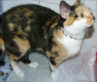 The new girl is teeny (she's about 9-11 months old but nowhere near as big as Tabasco and he's not a huge cat) and smoochy and playful. She's an RSPCA cat and has already had a litter just after she came into the shelter (far too young...please desex your pets!)