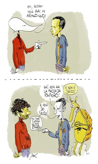 Infine sono costretto ad ammettere di non capirlo e comprenderlo di persona: non c’è un vero contatto, ci siamo troppo noi di mezzo, non ha l’armadillo immaginario al seguito che lo accompagna nei suoi fumetti, e questo mi spiazza. O ci spiazza entrambi.