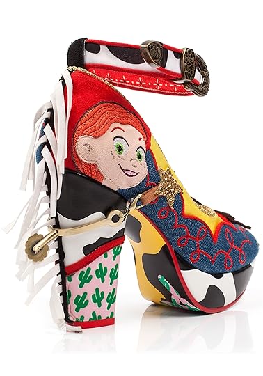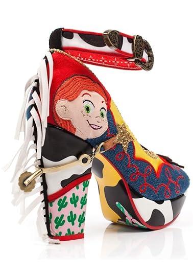 Not to be outdone, cowgirl Jessie gets a tall in the saddle ankle-strapped heel with lots of denim and buckles for good measure. But the best part of these decorative duds are the actual metal spurs attached to the back to make you feel like a real cowpoke. Yee-haw!