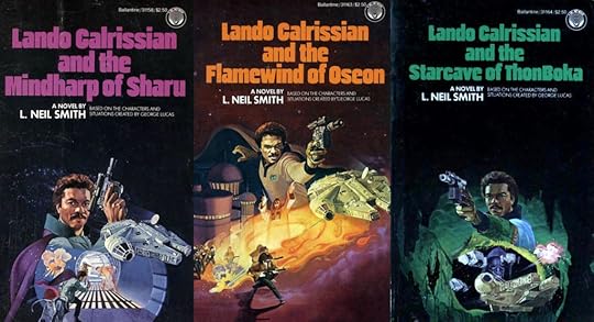 While Han and Beckett work on the Kessel heist, Lando stays aboard the Millennium Falcon to record the Lando Calrissian Chronicles, tales about his adventures. He mentions Sharu, which is a nod to the title of The Lando Calrissian Adventures Legends book Lando Calrissian and the Mindharp of Sharu. Mentions of Oseon and the StarCave Nebula are also references to this book trilogy.