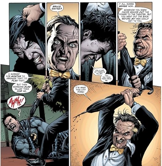 Geoff Johns’ modern update of the Penguin from his Earth One OGN features Oswald Cobblepot as a corrupt billionaire who is running for mayor against Bruce’s father Thomas Wayne. He even has it arranged so that Wayne is murdered, but Joe Chill beats him to the punch in Crime Alley. Nevertheless, this corrupt billionaire version of the Penguin proves to be a thorn in Batman and Alfred’s side in this cool post modern version of the character.