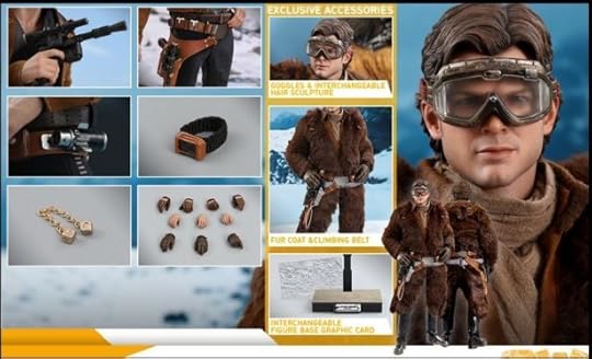 The figure comes with Han’s legendary blaster and holster, five sets of interchangeable hands, and his lucky dice. The deluxe edition also comes with goggles, interchangeable hair sculpture, a fur coat and climbing belt.