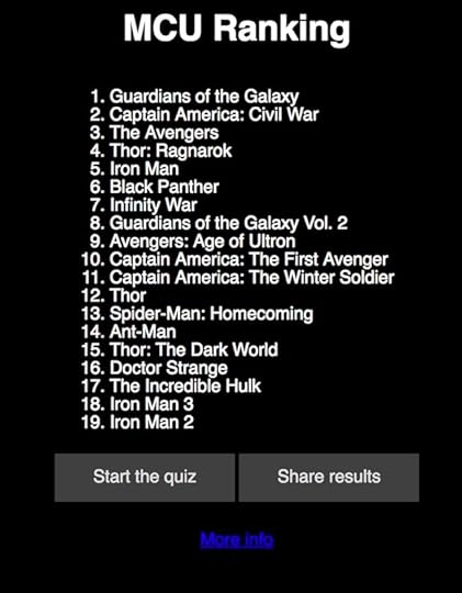 Which MCU movie is better: The Winter Soldier or The Incredible Hulk? That’s super easy, right? But what about the first Thor or Doctor Strange? Spider-Man: Homecoming or Age of Ultron? Where would you put Infinity War on the list? Is it even the best Avengers movie? With 19 Marvel films and so little separating many of them in terms of quality, trying to rank all of them is a daunting, possibly impossible task since you could make one today and have it be very different than one you might make in a week. Fortunately there’s now a website that will help you put together your very own rankings with a simple quiz that pits every film head-to-head. Though whether or not you will be happy with the results is up for debate.