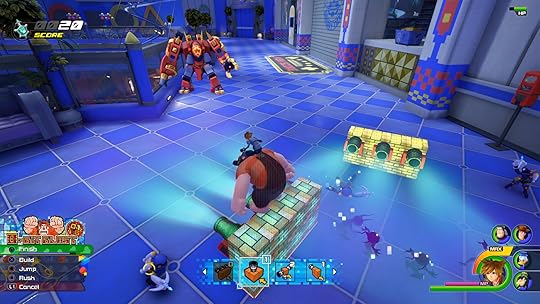 Link is the new word for Summons. You can still call upon your pals, but now they have a different name and more detailed controls. I linked up with The Little Mermaid‘s Ariel using “Lagoon” and Wreck-It Ralph‘s Ralph using “8 Bit.” A new addition to the Kingdom Hearts franchise, Ralph can build blockades and then wreck them. You can use his help to block in Heartless or split off a section of the battlefield, or you can tap into his brute strength to rush your enemies. Ariel, on the other hand, is more elegant. You can use her watery form to dive into Heartless or splash them, and her finishing move is like a small version of the Bellagio water fountains in Las Vegas that you can orchestrate for maximum effect. I’m going to need more gameplay time to nail the nuance of using the Links in the most optimal way and to appreciate the graphics and attention to detail. Ralph, for example, appears by coming out of the Fix-It Felix Jr. game.