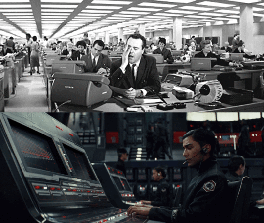 In The Art of The Last Jedi book, VFX director James Clyne cites the opening of Billy Wilder’s 1960 film as a reference point in designing the look of the common area onboard the Mega Destroyer. “There’s a scene in that film where its’s just rows and rows of desks… so again, not reinventing the wheel but paying homage and playing off of that.”