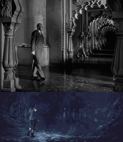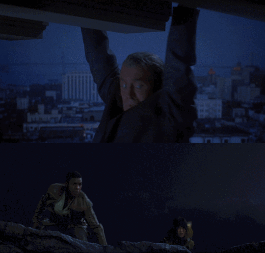 Hitchcock’s masterpiece uses a familiar technique (also seen most notably in Jaws) to highlight Jimmy Stewart’s characters fear of heights: the dolly zoom. The same technique is employed at the very end of the Canto Bight chase with Rose and Finn by a cliff.