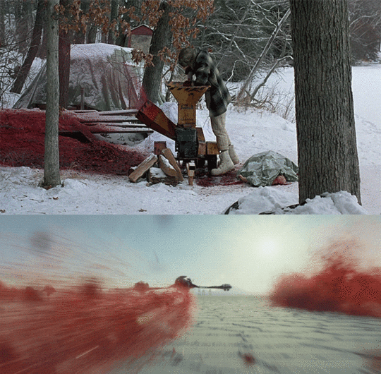 Heinrichs was the production designer for numerous films before The Last Jedi, including the Coen brothers’ Fargo. When designing the visual look of the battle on Crait, he drew inspiration for the blasts of deep red from a darkly comic moment from the 1998 film. “[The battle of Crait] is obviously a very graphic depiction of a violent battle that happens, the red on white and the rooster tail. I was actually thinking of telling Rian that I was inspired by the end of the movie Fargo which I had actually done, the wood chipper scene.”