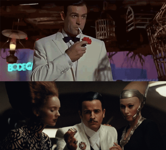 The Master Codebreaker’s attire on Canto Bight, a white tux with red plom bloom lapel, may recall Indiana Jones’ look in the opening Indiana Jones and the Temple of Doom for most. But, the look goes back even further, to the spy movie era of the 1960s. Sean Connery’s James Bond famously sports the accessory in Goldfinger. Justin Theroux’s codebreaker gets his fashion inspiration from the best.