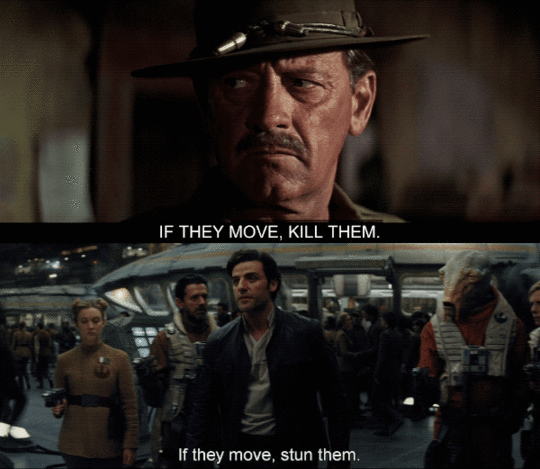 Poe Dameron’s dialogue during the mutiny sequence should sound familiar to movie buffs: it’s a riff on a very famous line spoken by William Holden’s character in the Sam Peckinpah directed 1969 Western epic.