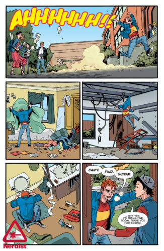 Our exclusive pages don’t spoil the secret which is going to upset the lives of Jason and Cheryl, but they do feature Archie breaking the fourth wall and once again failing at romance on multiple levels! Classic Archie. Mock and Fitzpatrick’s art jumps with life as we follow the hopeless romantic as he searches for his guitar and gets ready to perform at Riverdale High’s Spring Dance.