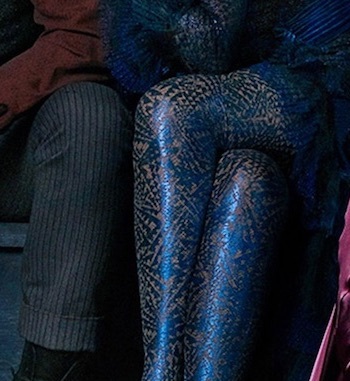 This photo might tell us something monumental about the future of Claudia Kim’s character, which could lead to a shocking revelation with major ramifications for Harry Potter. This image seems to confirm a fan theory, which we came across at Digital Spy, that her “blood curse” is turning her into a snake. First, look at her legs, which appear to be scaled.