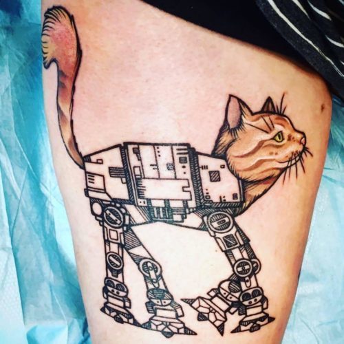 The Empire claimed the field in the Battle of Hoth in The Empire Strikes Back. They controlled the skirmish with superior forces, immense fire power, and lumbering AT-AT walkers. But what if their AT-ATs turned into purrfect, meowing felines? They would have curled up on the icy Star Wars planet for naps instead of attacking the rebels, and the universe wouldn’t be the same. This is the galaxy I imagine when I look at Laura’s sweet CAT-AT tattoo.