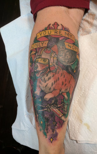 It’s no small thing to improve upon Star Wars, but Scott has done so with this tattoo. The design combines the galactic setting with Scott’s best pup pal. The corgi X-wing pilot that is the star of this ink is Carlton, who is, by the way, named after Carlton Banks in The Fresh Prince of Bel-Air. Scott told Nerdist he saw a tattoo of a dog floating in space and wanted to tweak the idea to make it unique to his tastes.