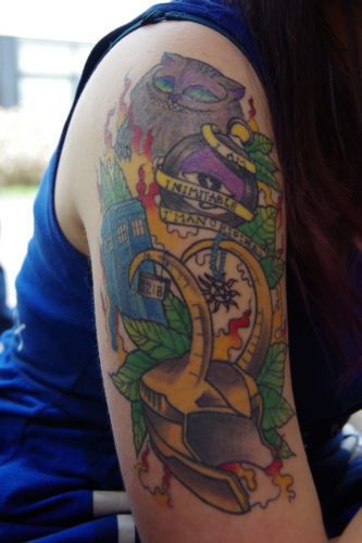 The idea of incorporating multiple fandoms into a single tattoo is intimidating to me, but anything is possible with the right tattoo artist. Proof is visible in Lin Kat’s arm piece that features nine fandoms. NINE. The tattoo includes the Cheshire Cat from Alice in Wonderland, an Aaron Burr quote from Hamilton, the TARDIS from Doctor Who, a Supernatural symbol, Loki‘s helmet, a Sherlock nod, and an eye that could represent Sandman, A Series of Unfortunate Events, or Welcome to Night Vale.