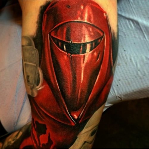 The tattoo was created over a span of six years from start to finish, with over 50 hours in the chair getting inked. It started with a tattoo of Luke Skywalker’s lightsaber by Rich Kocis at Peace of Art Tattoo and then took on a new life with Imperial helmets. P. Krol of Krol Body Art in Chicago completed that portion of the tattoo.