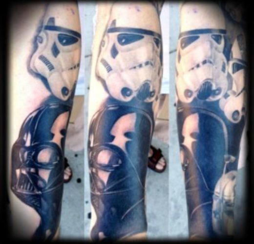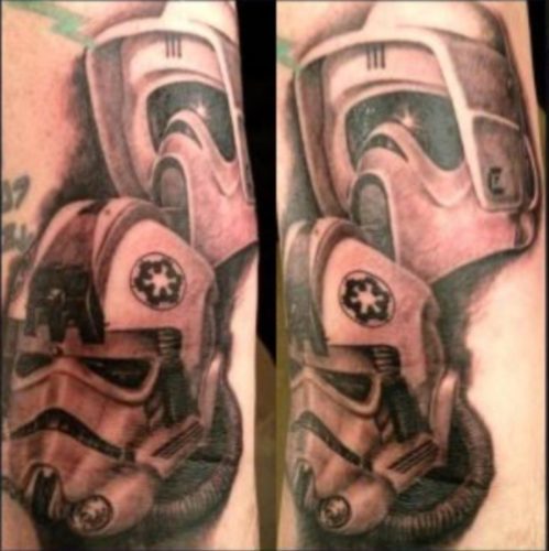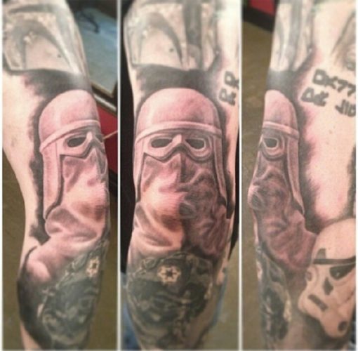 Stormtroopers. Clone troopers. Snowtroopers. Star Wars has a lot of troopers, and that translates to an array of helmets. Todd Hoffman, an avid Star Wars fan and member of the Midwest Garrison of the 501st Legion, focuses on those helmets in his tattoo sleeve. He loves the original design of the stormtroopers in A New Hope and the idea of a sleeve focused on that helmet turned into an evolution and appreciation of all Imperial troopers.