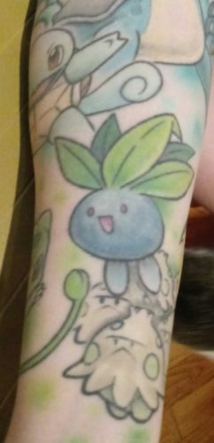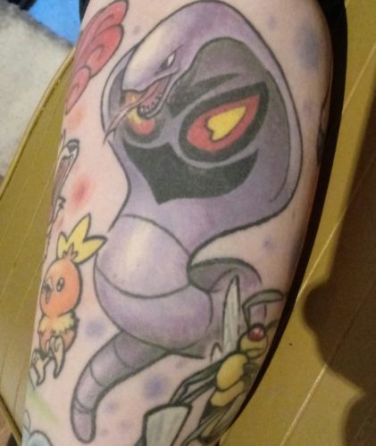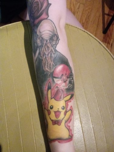 Sudy got the idea for the Who and Pokémon crossover because of a present she received in a redditgifts exchange. Redditor dragon71 drew an Ood holding a Poké Ball and that spawned ideas for Sudy and her tattoo artist Billy Bubbles Tattoos. She gave Billy guidelines and he did his own renditions of all the art.