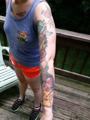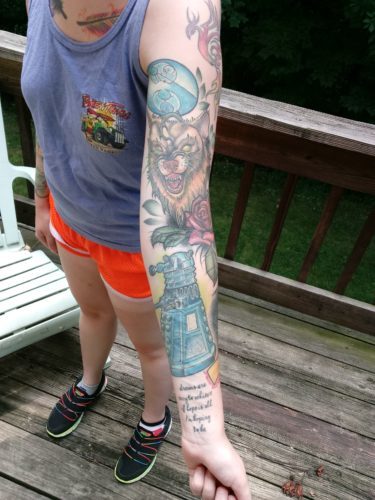 When the Doctor regenerates, anything is possible, right? In Katherine Sudy’s Doctor Who tattoo sleeve, the timey wimey realm of the TARDIS is combined with Pokémon to give us memorable imagery—like an Ood holding a Poké Ball and Pikachu as the the fez-wearing Eleventh Doctor. No, really.