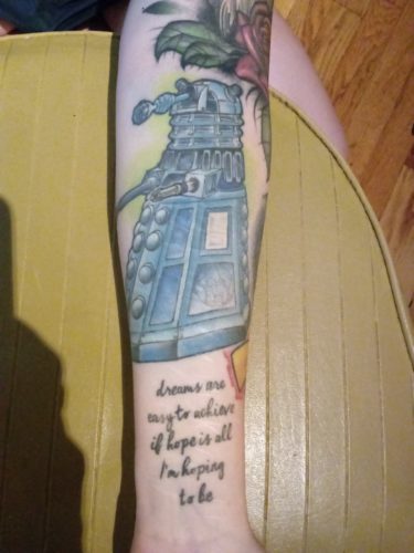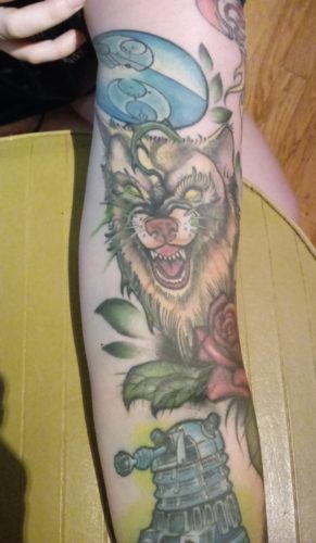 Time travel to the gallery below to get closer looks at the various elements of the tattoo, including Gyrados, a Bad Wolf (note the inclusion of a rose as a tribute to Rose Tyler), a Doctor Dalek, a Dr. Horrible quote, and more.