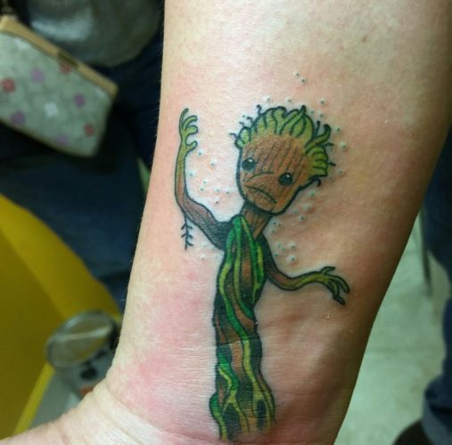 Brian Lejman is a tattooist and manager at Premier Tattoo in Louisville, Kentucky, and he has completed more than a few pop culture-inspired tattoos in his career. Books, films, comics, music—he’s made tattoos from all sorts of mediums come to life for his clients. I’m particularly taken with this little Groot: