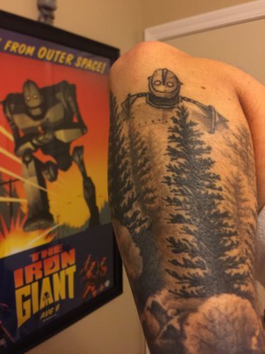 If you’re someone with multiple tattoos, you probably have a favorite of the bunch. It’s okay. You’re allowed. Ezequiel Gutierrez says his favorite of all his pop culture-inspired ink is his The Iron Giant tat. He decided to add the image to his skin after the film recently returned to theaters. Gutierrez worked with his tattoo artist and they kept the ink simple. They gave him a nature-inspired background, per the setting of the film. Ezequiel says, “[We] placed him exactly where he should be, amongst the trees.”