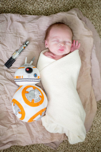 They’re already dressing up their daughter, too! Callie–which, by the way, is their shortened version of Khaleesi–is wrapped up in material from a Rey cosplay Michel was already building. It’s good to start this Jedi business young.