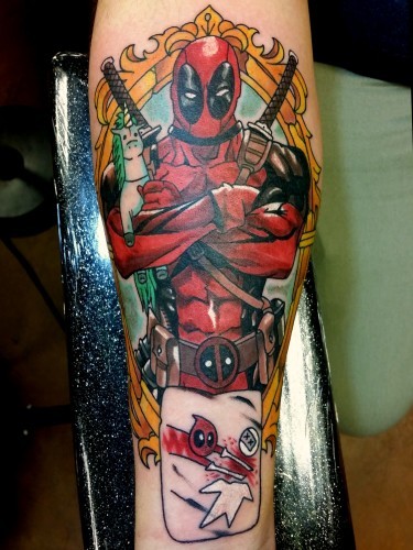 If you’re in the neighborhood of Las Vegas, Nevada and itching to add some bold and dynamic comic book art to your skin, take a break from the casinos and see Steve Rieck. The tattooist is a nerd and has inked all sorts of takes on your favorite characters from Marvel and DC comics. His art features likeness inspired by both the page and by actors in live-action films. The colors are so bright it’s like the characters were transferred from comic book to skin. This Deadpool ink is just one example: