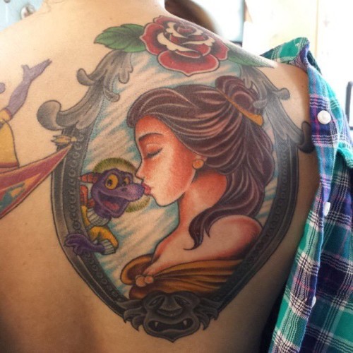I can totally seeing the Beauty and the Beast’s leading lady being pals with Figment, the sweet purple dragon from EPCOT at the Walt Disney World Resort. If you’re not familiar with the little guy, he’s part of Journey Into Imagination. Back to the tattoo, I particularly the way the portrait is framed. It looks like an elegant painting, and the frame has touches from the animated film with the rose and the gargoyle.
