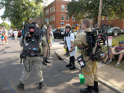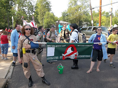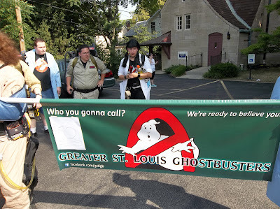 Still, I've tried to find a little fun in all this sweltering heat. Independence Day started out in the mid-80s, so I figured I could make it through a two mile jaunt called the Webster Groves Independence Day Parade. I didn't go it alone, of course, as I accompanied the Greater St. Louis Ghostbusters along the route. We passed out candy and flyers for the upcoming unofficially first-ever Ghostbusters sci-fi con, Ecto Con.