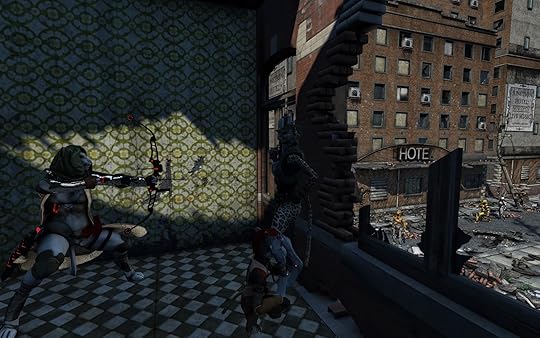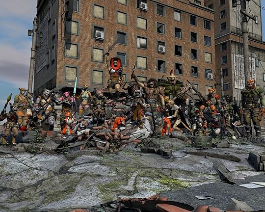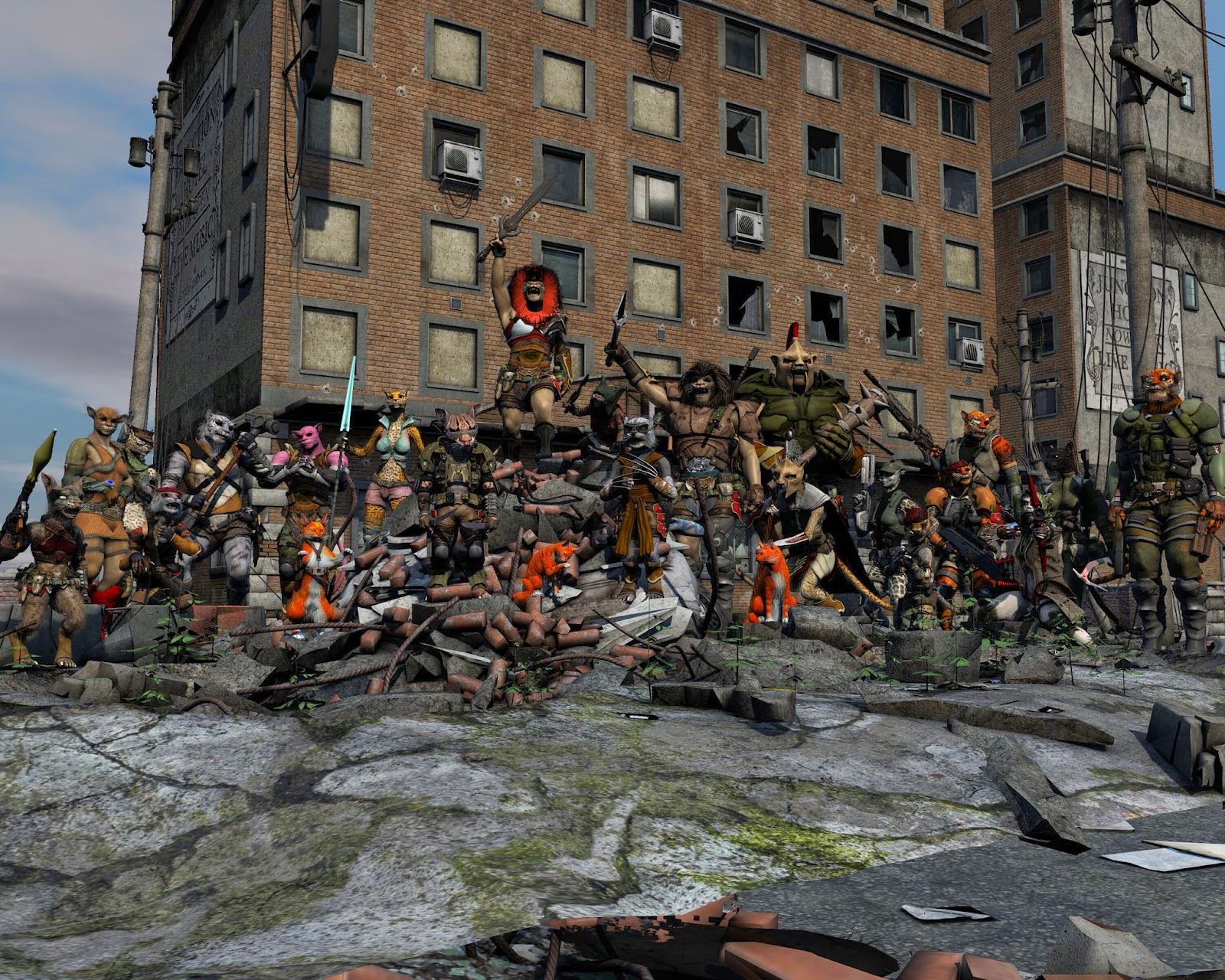 Obviously kudos go to Rawart and Dariofish for the base models. Also Stonemason for the awesome background and car pile, as well as Dreamlight for putting them together. The clothes and weapons are all over the place, too numerous to list here. I remember complicated eve, bonesmasher, magus, dragon master, mos invasion, magus, slicer, voyager, war hammer, war dog, war vixen, urban paladin, future wildness, and others off the top of my head.