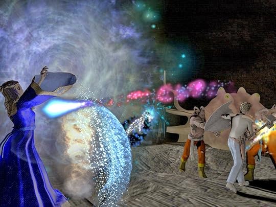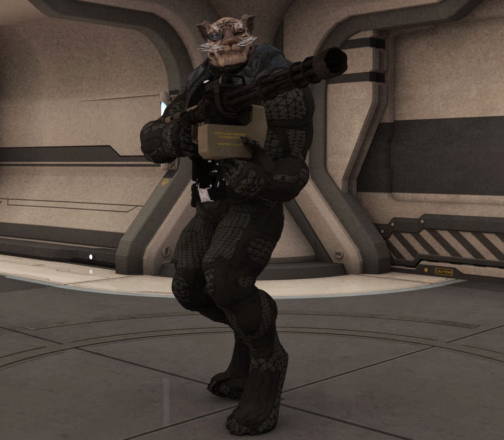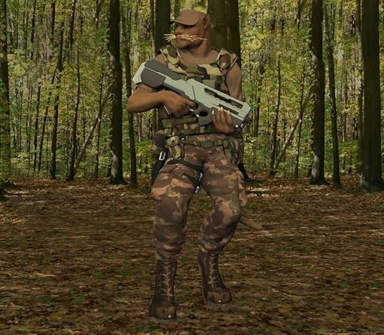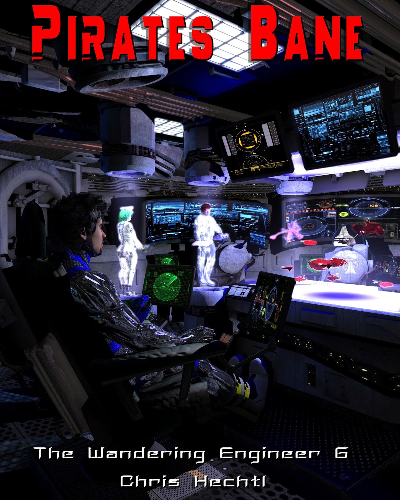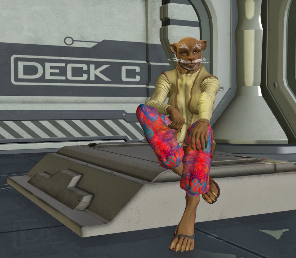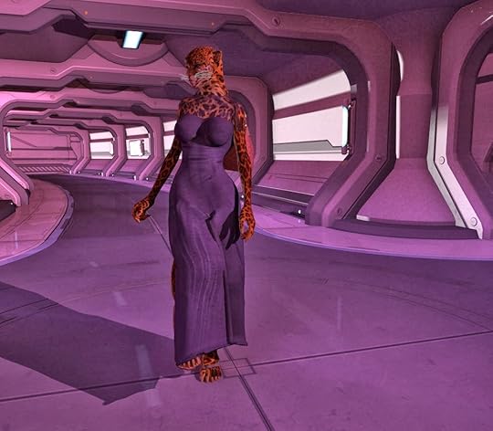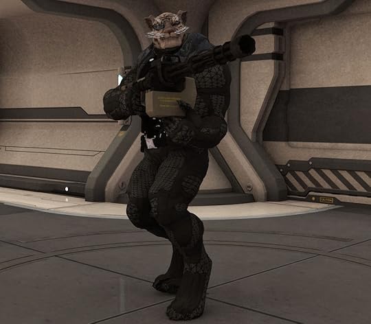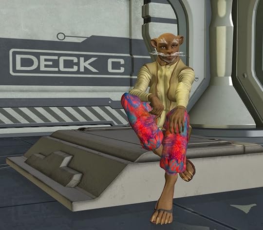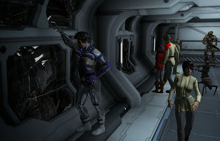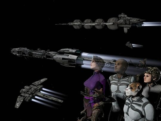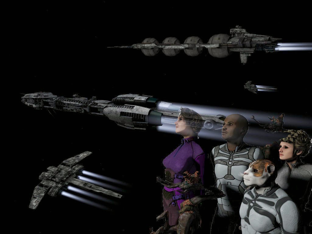 On the bottom right of that corner some of the bridge crew of Prometheus are shown. Captain Shelby Logan is in blue. The others are 1st LT Zeb the Veraxin in the deep background, in front of him is the TACO Conrad Murray, and the lady with curls is Chief engineer Cynthia Troll. In the foreground is the female Veraxin doctor V'brno and the calico neocat navigator Lt Silverfish.For those of you wondering, Prometheus is in the center of the shot, with Bertha, a tanker in the upper part of the image, and two frigates as escorts on the flanks.