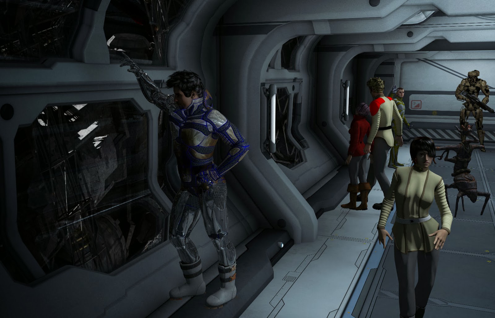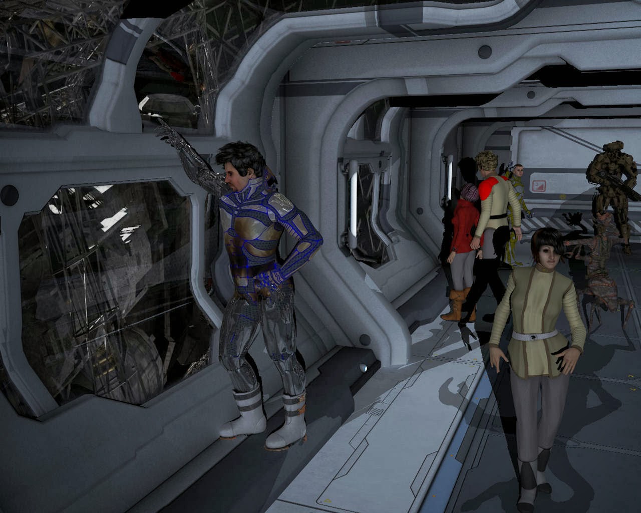 On the bottom right of that corner some of the bridge crew of Prometheus are shown. Captain Shelby Logan is in blue. The others are 1st LT Zeb the Veraxin in the deep background, in front of him is the TACO Conrad Murray, and the lady with curls is Chief engineer Cynthia Troll. In the foreground is the female Veraxin doctor V'brno and the calico neocat navigator Lt Silverfish.